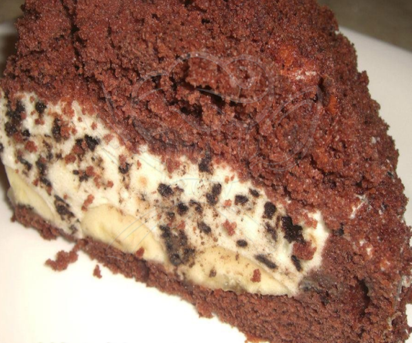 Spread the loveKakaový korpus plněný čerstvými banány a stracciatellovým krémem, zdobený drobenkou z těsta.