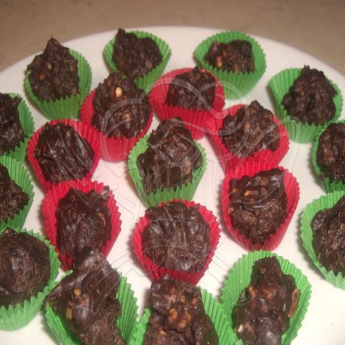 - K rozpuštěné čokoládě přilijeme salko a postupně přisypeme nasekané ořechy, rozinky a kandované ovoce