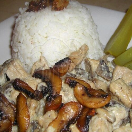 Rychlý oběd plná chutí. Šťavnaté maso v krémové omáčce, doladěné kapkou octa pro svěžest a zdobené křupavými žampiony na másle.