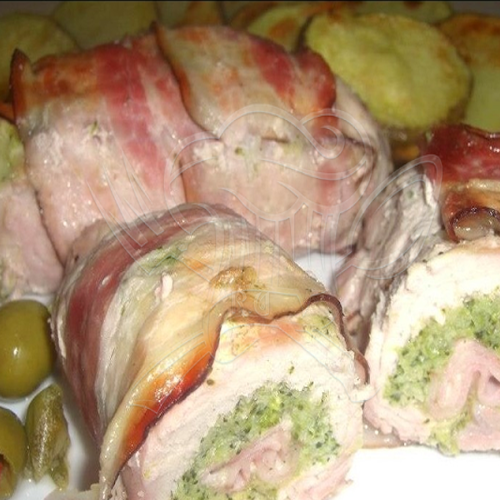 Křehké vepřové závitky plněné jemnou česnekovou brokolicí a šunkou. Obalení v anglické slanině dodá pokrmu šťavnatost a křupavou kůrku.